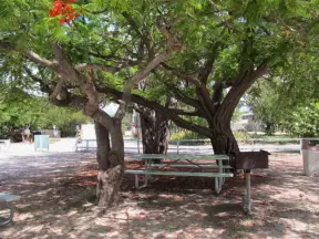 Huge wide trees, picnic tables, and a new playground, plus beach parking, but entry costs $18!