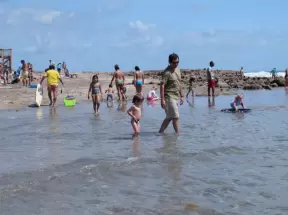 Gorgeous ocean colors, fun crowd of families, shallow water with little bouncy waves.