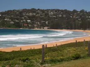 Stunning beach with orange-pink sand, blue-green water, gorgeous flower-studded headland, and rock pools that kids love to explore.