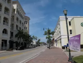 Main strip of West Palm Beach, with colorful and inviting architecture and decorations.
