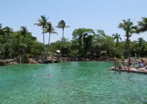 Unique spring-fed historical pool with Venetian-style buildings, bridge, striped posts, waterfall, caves, palms, and banyan tree. Glorious!