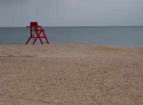 Peaceful spot with nice sand (great for building), blue water (from a distance), the sound of water lapping the shore, green lawn, playground, and trees for shade.