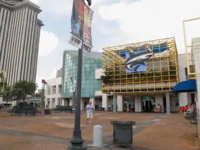 Outdoor mall with movie theater, cafes with atmosphere, candy shop, and more.