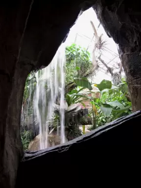 Hotel inside a giant atrium with tropical plants, fish, alligators, and decorations. ICE sculpture event in December.